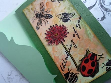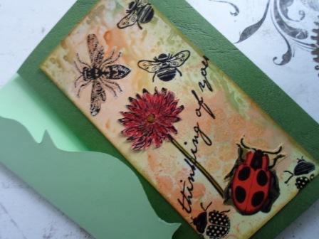 Přání v meruňkové a zelené barvě, základ karton v zelené barvě s vytlačeným vzorem kůže. Ručně barveno, razítkováno, vel. přání cca 10 x 17 cm. Ručně vyrobená zdobná obálka. Obálka nemá lepicí stranu, tudíž je nutné ji zalepit ručně.
